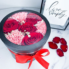 Cette box à offrir est composée de roses rouges naturelles , fraiches et d'oeillets, une dose de gypsophiles dans une box en cartons ronde réutilisable. Pas besoin d'arroser. juste poser la box à l'endroit de votre choix et la laisser vivre sa vie.